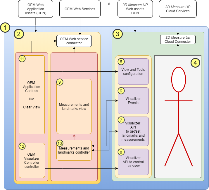 The 3D Measure Up widget will be embedded in the OEM Application Frontend. The 3D Measure Up Visualizer will communicate with the 3D Measure Up Cloud service to retrieve measurements and landmarks of the human body. The interaction between the OEM Application UI components and 3D Measure Up Visualizer will be via client API calls and events.