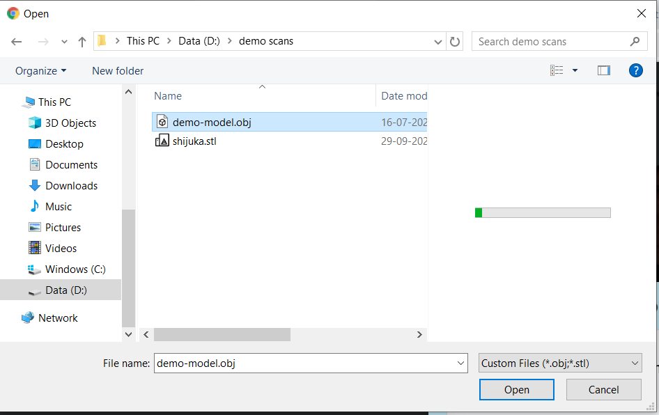F. Find and select the model file (OBJ or STL). Click on Open.