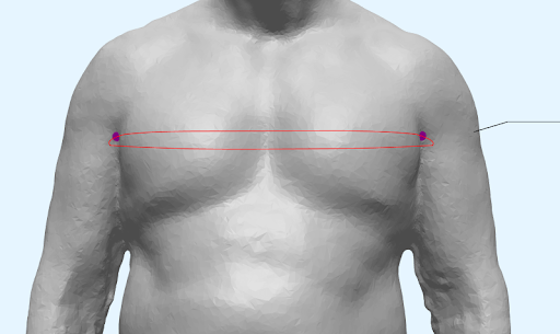 Right Side Neck Point To Belly Button | 331 | Length along surface on the front side of the avatar from the right side neck point to the point 2 inches ( 5.08 cm ) below the belly level on the mid sagittal plane |