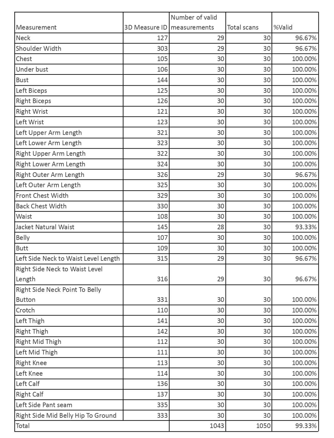 Scanned 30 people, got their manual measurements, and compared the differences with automated measurements obtained from 3D Measure Up.